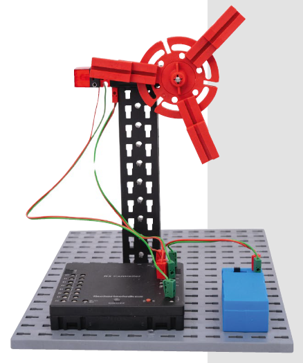 windkraft_mit_rotor: Baut einen Rotor auf den Turm des Windrads und lasst ihn mit einem Motor drehen.
