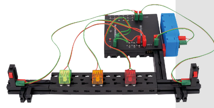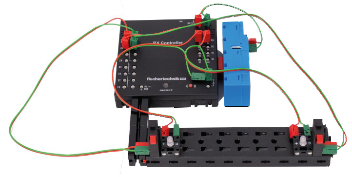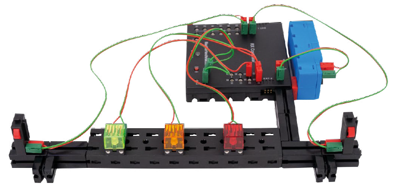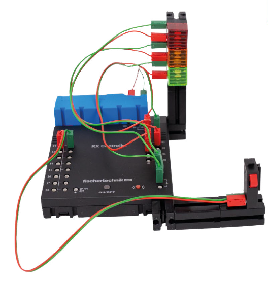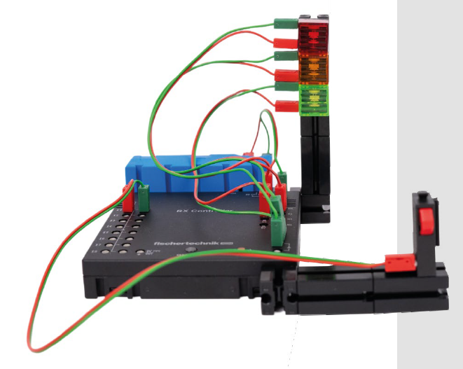 ampel: Schließt für die Ampelanlage drei LEDs in den Farben rot, gelb und grün sowie einen Taster an den RX Controller an. Durch Betätigen des Tasters soll die Ampel von rot für eine Sekunde auf gelb und anschließend für fünf Sekunden auf grün schalten. Danach soll sie wieder eine Sekunde gelb leuchten, bevor sie erneut rot anzeigt.