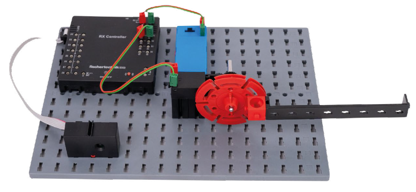 schranke: Baut eine Schranke aus einem Motor mit Getriebe. Schließt den Motor und den RGB-Gestensensor an den RX Controller an. Programmiert die automatische Schranke. Hinweis: Zur zuverlässigeren Entfernungsmessung sollte der RGB-Gestensensor an der Tischkante platziert werden.