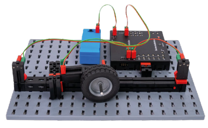 hinundher: Baut eine Konstruktion, bei der etwas von links nach rechts fahren kann. Ergänzt jeweils am Ende der Fahrbahn einen Taster, der von einem Fahrzeug aktiviert werden kann. Das Bild kann euch eine erste Idee liefern. Programmiert das Fahrzeug so, dass es von allein gegen die beiden Taster fahren kann und anschließend die Richtung wechselt.