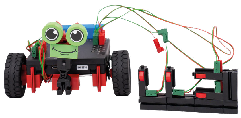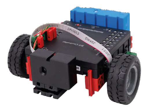 autonomeRoxy: Baut Roxy nach Anleitung zusammen und befestigt, wie auf dem Foto zu sehen, an der Vorderseite den RGB-Gestensensor. Schließt den RGB-Gestensensor an den RX Controller an. Programmiert den RGB-Gestensensor so, dass er als Entfernungsmesser Hindernisse erkennt. Bei einem auftretenden Hindernis soll Roxy dieses umfahren.