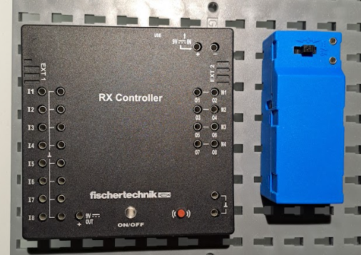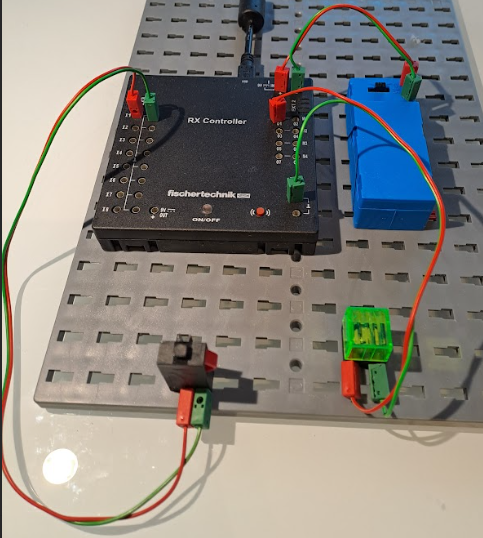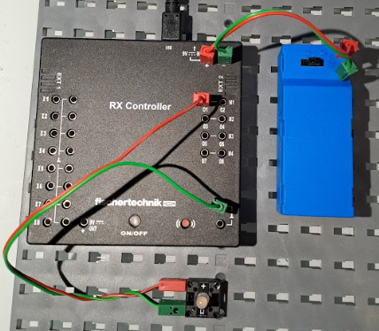 Wenn wir wie abgebildet verkabeln, dann schalten wir die Stromversorgung dadurch an, dass wir den schwarzen Schalter zu den Kabeln verschieben. Wir müssen dann einige Sekunden auf den on/off Knopf des Controllers drücken, dann wird der das Kontrolllämpchen rot.