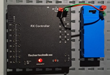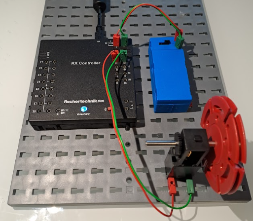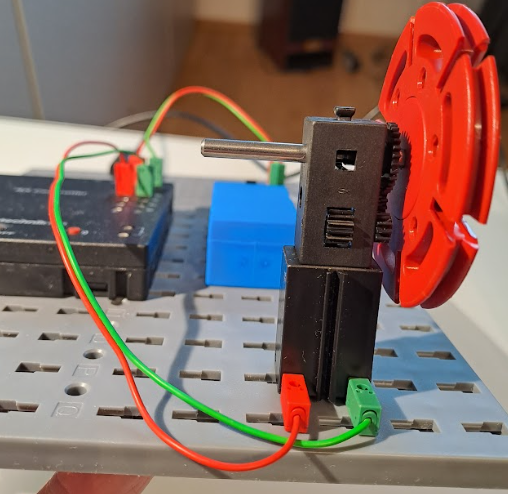 Den Motor schließen wir an einen der Ausgänge M1-M4 an. Hier ist Plus und Minus egal, der Motor dreht sich dann jeweils in die andere Richtung. Wir müssen nur darauf achten, dass wir am Motor nicht zweimal an derselben Seite anschließen. Wenn wir den Motorblock entlang des Nutstreifens teilen, müssen die beiden Kabel auf unterschiedlichen Seiten angeschlossen sein, sonst funktioniert der Motor nicht.